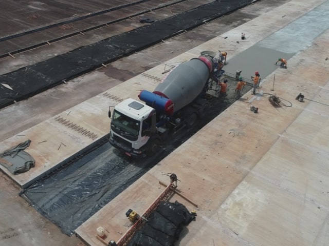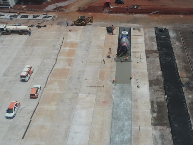 - Acabamento Vassourado: Aplicação de textura superficial antiderrapante (vassourada), essencial para garantir a segurança e a aderência das aeronaves e veículos de apoio.
